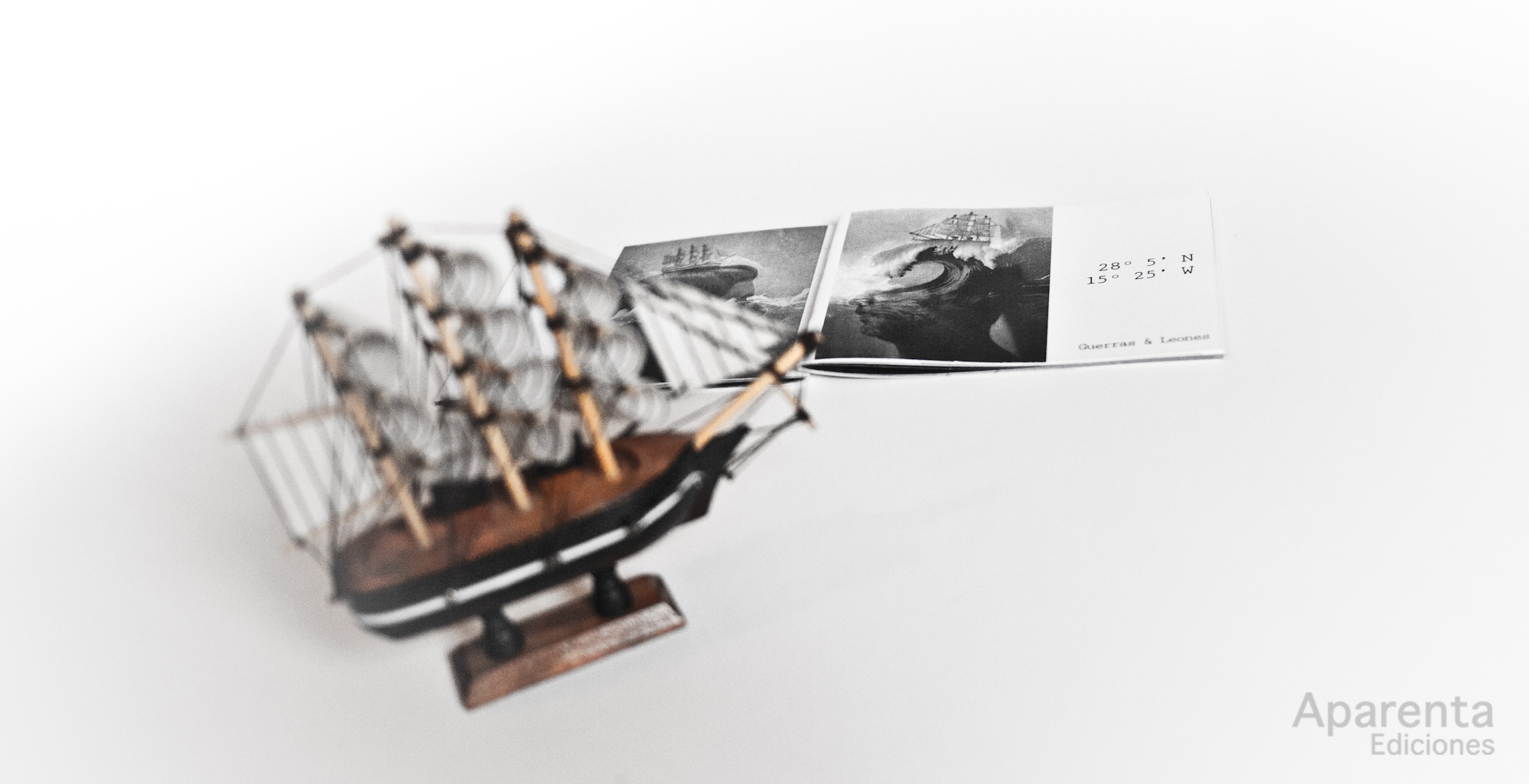 28º5’N 15º25’W es una publicación de Aparenta Ediciones. Realizada a medias con la artista visual Irene León. Un trabajo cuyo contenido fue elaborado al cincuenta por ciento, tanto el texto como las fotografías y las composiciones. Colaboraciones que publivamos bajo la firma de Guerras & Leones.