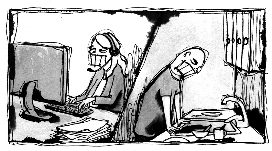 El hombre abre los ojos a las seis de la mañana. Y se levanta. Se levanta a las seis porque es mejor hacer algo, cualquier cosa, que no sea seguir boca arriba, en la cama, durante toda la noche. El techo y sus sombras. Ella a su lado. Pero ella duerme, y por eso a las seis él camina de puntillas, en la habitación, y en el pasillo. La intención es preparar el desayuno para ella. Café y tostadas a las seis y media, y beso de despedida a las siete. Y cuando ella cierra la puerta, él recoge las migas, él lava los platos, él seca las tazas, un reparto de tareas práctico porque ella, se dice él cuando se apoya en el fregadero, al menos, ella tiene trabajo.