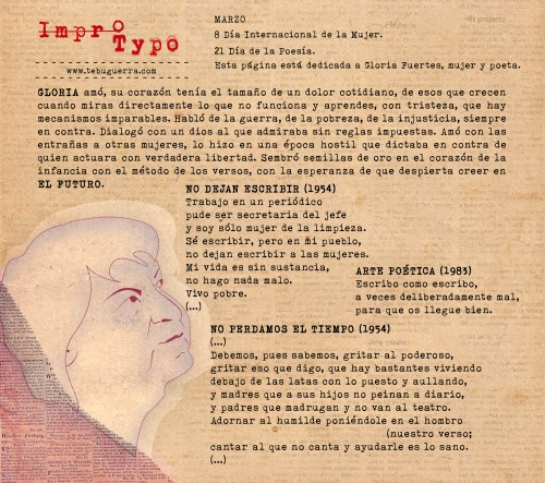 Página para La Brújula Guía de Ocio y Cultura del mes de marzo de 2021. Dedicada a la inigualable Gloria Fuertes, poeta de lo social, con sensibilidad extrema, y mediática en su faceta infantil.
