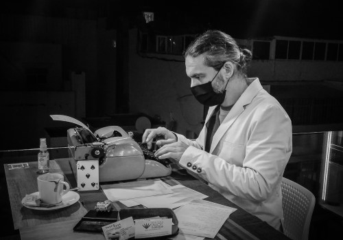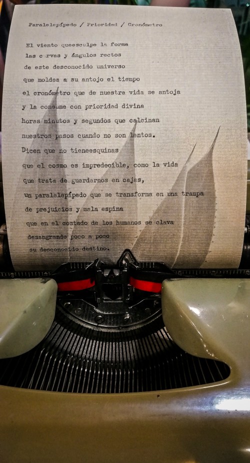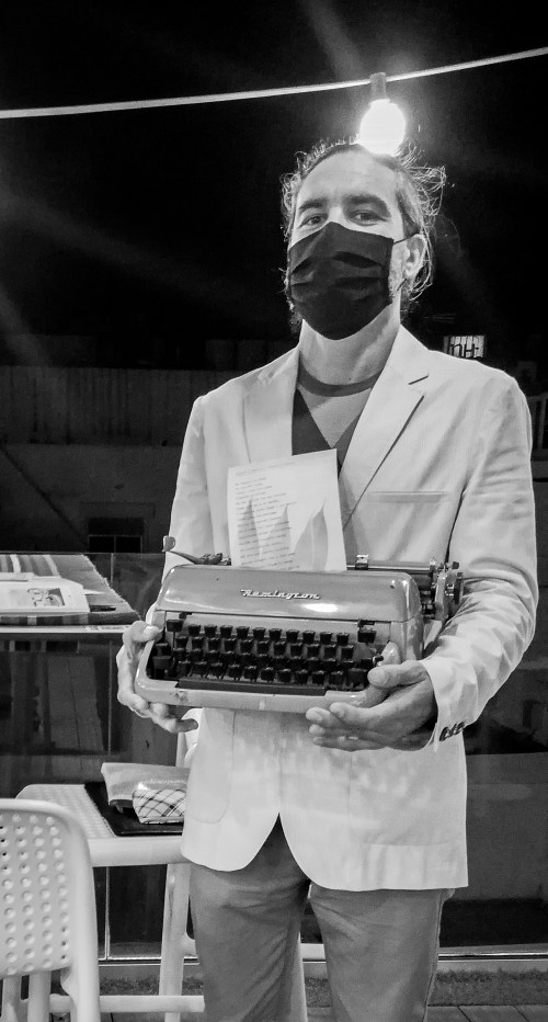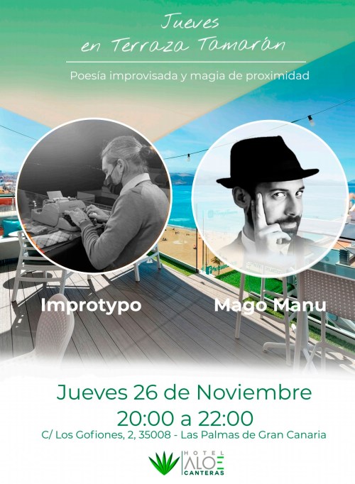 Junto a Mago Manu, Impro Typo interviene con su acción de escritura en vivo en la Terraza Tamarán, situada en la octava planta del Hotel Aloe Canteras. La acción se desarrolla de mesa en mesa interactuando con los clientes de la terraza, que me dan el motivo, a menudo tres palabras, sobre las que escribir al momento y personalizado un texto con las indicaciones que me han dado. De esta manera se llevan como recuerdo un regalo exclusivo, personalizado, a modo de vivencia y una pieza escrita a máquina de Impro Typo.