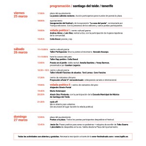 realidad poética contemporánea sin límites de fronteras o formatos. Recitales, proyecciones, exposiciones, talleres y un paseo poético se reparten durante 3 días en varios espacios de Santiago del Teide.