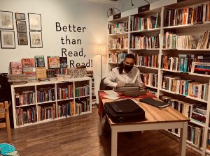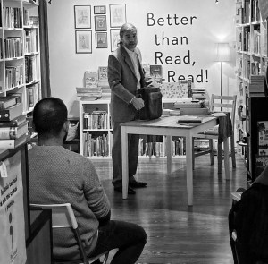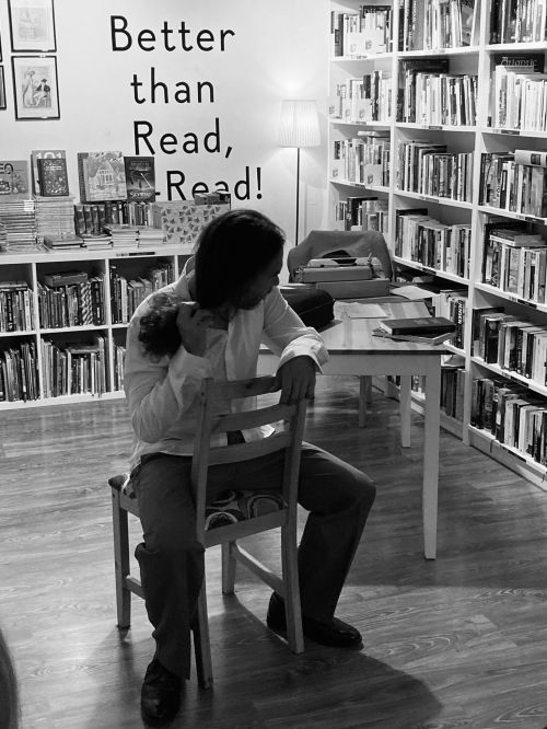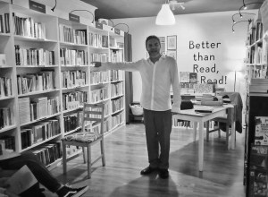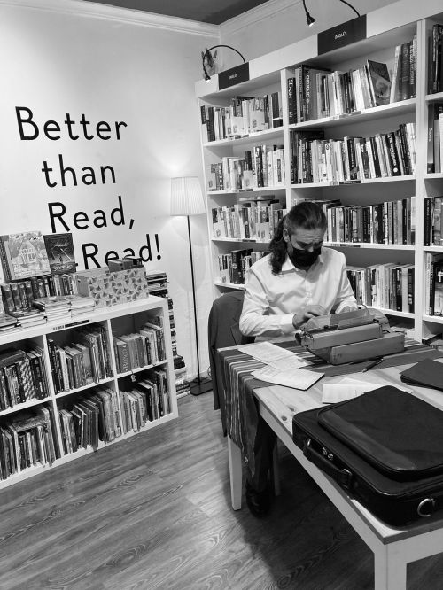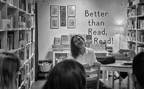 Actuación del espectáculo de poesía escénica «Un jarrón al borde de la mesa» en la librería Re-Read Las Palmas. Rodeado por libros y más libros y con iluminación convenientemente intimista, la librería se transfomó en el escenario para este espectáculo de poesía escénica y monólogo.