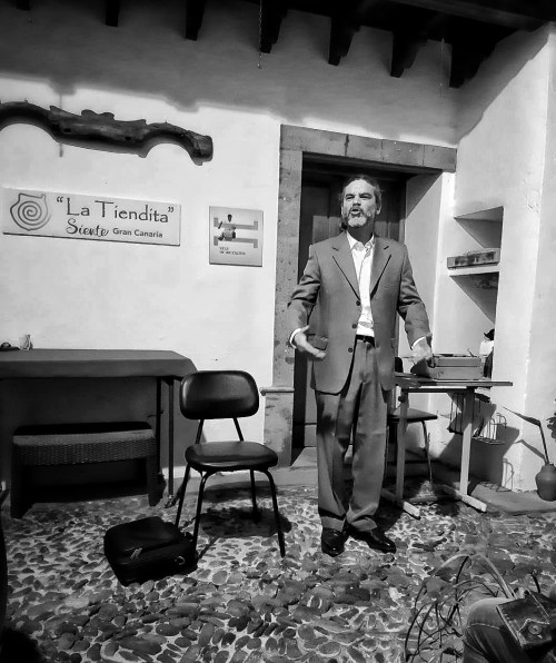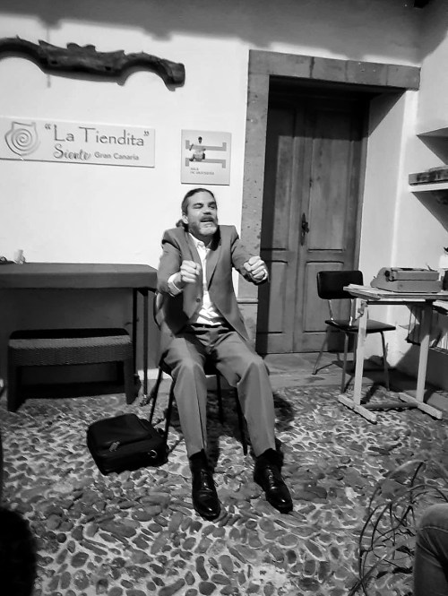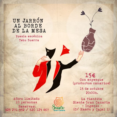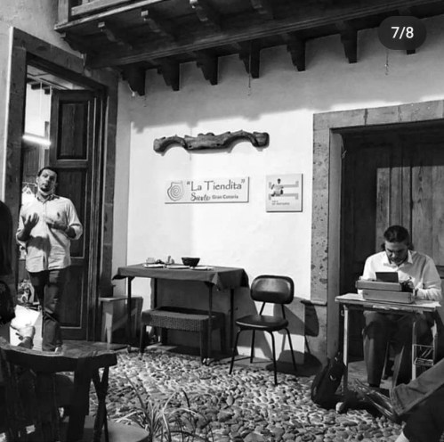 Actuación del espectáculo de poesía escénica «Un jarrón al borde de la mesa» en La Tiendita en pleno centro de Ingenio. Espectáculo de poesía escénica y monólogo con escritura en vivo y al momento, maridado con un enyesque propio de «La Tiendita».